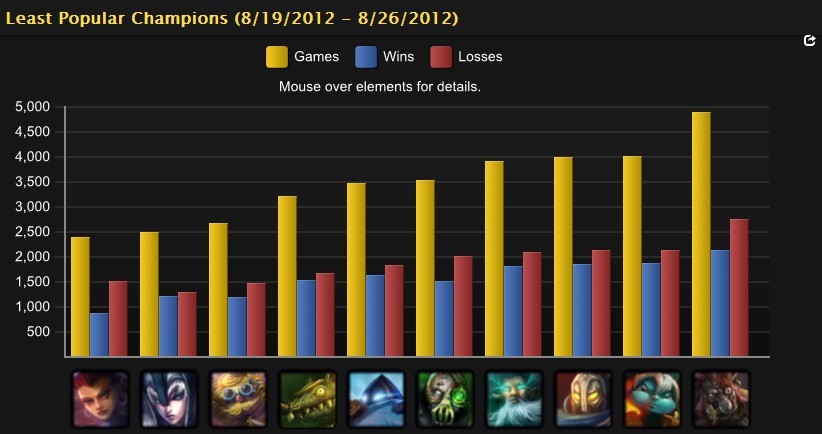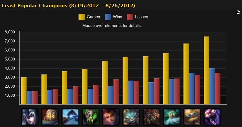 万年冷板凳扇子妈不负众望,冷门英雄排行榜从推出到现在都是她的;重做后的老鼠实在让大家失望,所以使用率不高是必然的结果;而厄加特在几轮改动后彻底让他的支持者们心寒了, 除了使用率之外,他的胜率也在直线下滑。