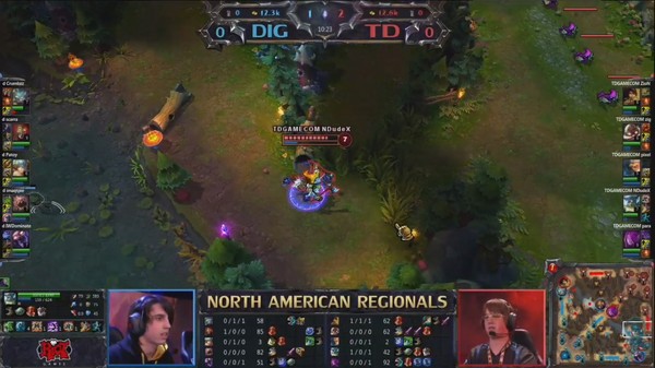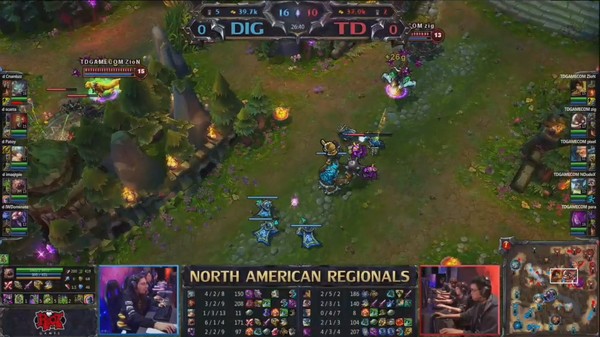 不过几波精彩的反gank让DIG将人头反超,而在14min时,TD强拿小龙结束欲往中路集合推塔,但DIG在草丛打了一波精彩的团战,仅阵亡琴女打了一波1换4,拉回小龙经济。人头比7:3DIG领先。