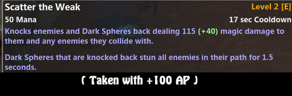 虚弱分离(E):造成魔法伤害在一个锥形区域,并且击飞敌人基于他们离Syndra的距离.