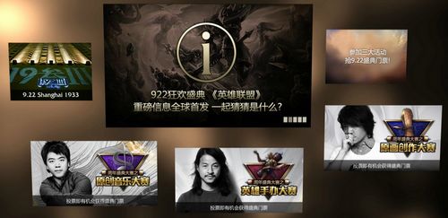 三大创作大赛分别为原创音乐大赛、原画创作大赛、英雄手办大赛,大赛设置现金大奖十万,并邀请专业大腕,国际知名音乐人郎朗、漫画家本杰明、国际知名玩偶设计师michaellau担任评委;优胜者不仅能获得现金奖励还将获得狂欢盛典限量入场券,同时,以《英雄联盟》目前的火爆程度,优胜者也意味着将一战成名。