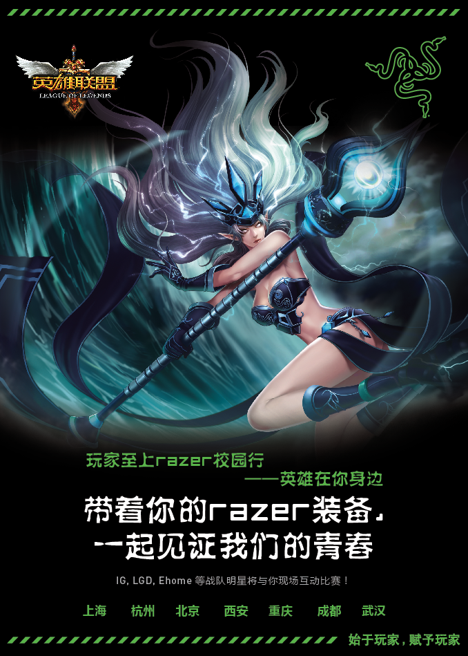 2012年9月20日至11月1日,全球游戏硬件领导品牌——Razer(雷蛇),将携手时下最火爆的游戏《英雄联盟》展开“玩家至上Razer校园行”巡演活动,走进上海、杭州、北京、西安、重庆、成都、武汉全国七个城市的校园,首站将于9月20日在上海正式拉开帷幕。Razer与英雄联盟将把最高端的游戏硬件产品、最完美的游戏体验结合在一起,并会有众多与LOL情谊深厚的神秘嘉宾现身各地校园,与广大玩家共同重温那些与Razer、与游戏一起走过的美好记忆。