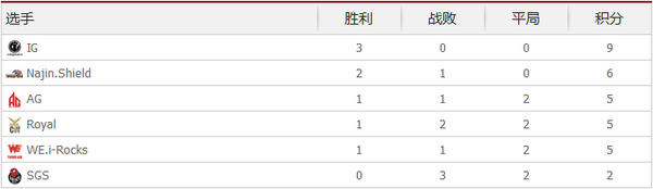 除iG以外,目前出线形势最好的当属目前积6分的韩国强队Najin.Shield,还剩余2场比赛的Najin,只需要拿下任意一场便可以9分出线。而目前同积5分的WE.i-Rocks以及AG迅游两队,都还剩下一场比赛,即便能够顺利拿下,也还要看iG和Najin的脸色才有机会出线。