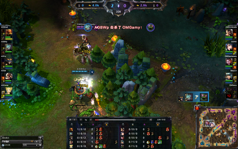 开局双方在中路激情交换了一波技能后各回各家,AG迅游直接5人抱团强抢OMG牛头的蓝BUFF,但是OMG也是选择了对方的蓝BUFF。双方互换了蓝BUFF。AG迅游是让船长单下,上路男枪+风女压制吸血鬼,这个分路也是比较特别,看来是想利用船长的抗压性来寻求一些上路的发育。打完BUFF后,梦魇上路直接蹲点吸血鬼,但是牛头也是意识到了,来到3路保护吸血鬼。但是梦魇在草丛蹲点牛头,男枪与风女同时闪现击杀牛头拿到1血,但是塔下吸血鬼靠塔双杀。相对来说吸血鬼还是比较赚。
