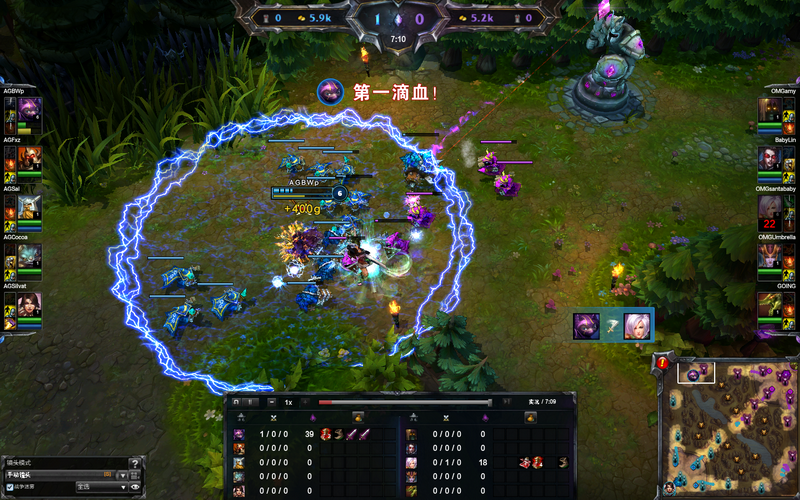 开局AG迅游直接下路草丛蹲点,但是被OMG发现,但是OMG很不理智的就在小龙门口卖骚,直接被AG迅游一波追杀追到中路1塔门口,瞎子Q到琴女拿下一血。之后OMG想要强抢AG迅游的蓝BUFF挽回一些劣势,但是大树被赶来的卡牌支援后击杀。紧接着,狐狸在支援路上又被对方3人堵在大龙门口直接击杀,3比0!下路飞机和风女配合非常到位,击杀对方琴女后又越塔击杀了飞机。开局5分钟AG迅游大优,直接领先了3K的经济。