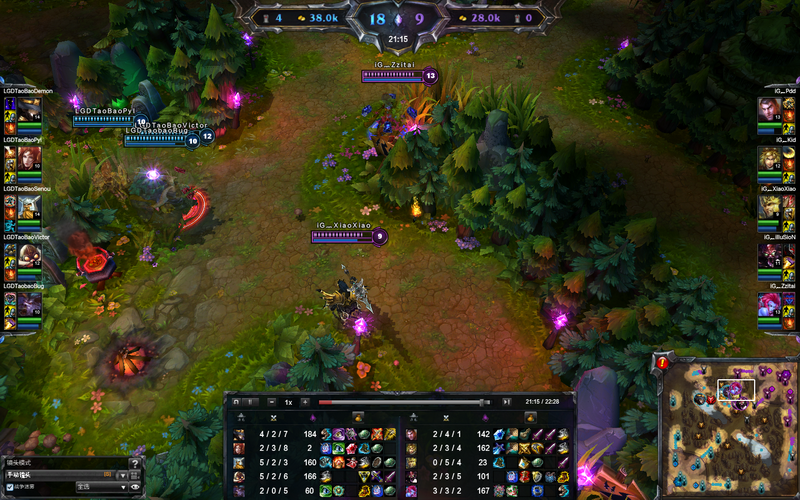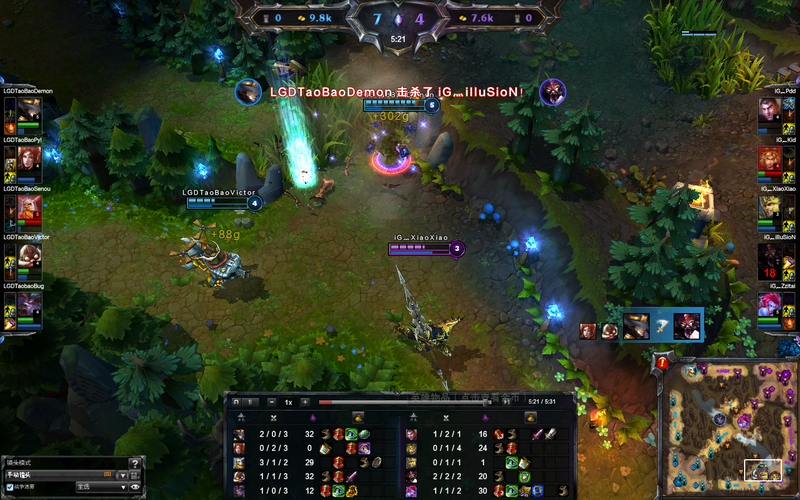 20min,LGD跟随有400的牛头埋伏对方野区,直接秒掉了走位冒进的皇子,但是之后IG的EZ走位还是比较谨慎,配合大虫子的卡位支援,没有让LGD进一步扩大战果,最后LGD 3换4 IG。