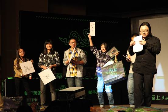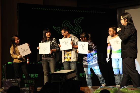 图为现场互动时看谁画Razer LOGO最像的评比活动,各位学生都释出艺术功底给大家展现了自己的作品,最终由4号MM以创意获得大奖地狱狂蛇鼠标一个。