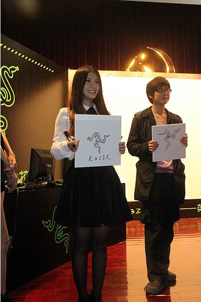 图为现场互动时看谁画Razer LOGO最像的评比活动,各位学生都释出艺术功底给大家展现了自己的作品,最终右边的GG发扬精神把第一让给了左边的MM获得大奖地狱狂蛇鼠标一个。