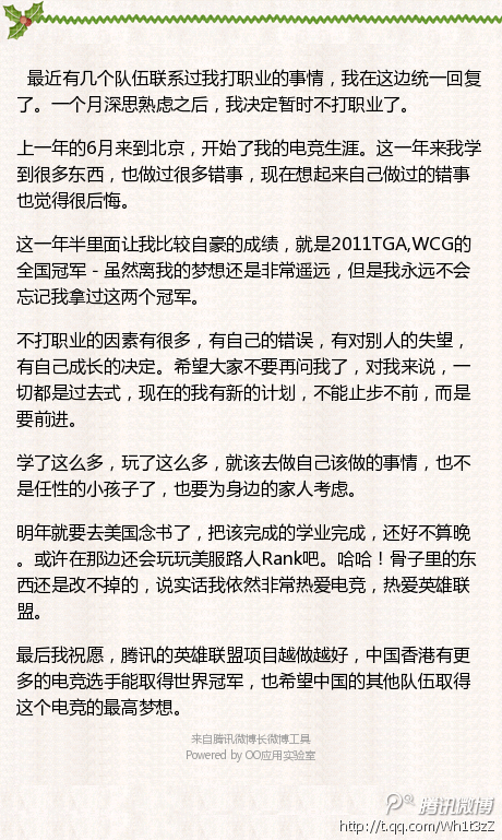 明星选手white宣布退役,他发表了一份个人声明,表示后悔自己做过的错事,并表示计划去美国念书,依然热爱电竞。