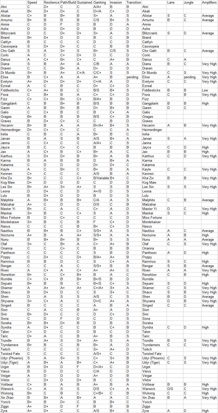 有些人似乎看不懂以下的排名。很明显S评分要比A评分高。lane和jungle评分能让大家大致地看出一个英雄在遭遇敌方对线/打野英雄时的对抗能力。高lane评分意味着该英雄去gank强对线英雄的成功率较高,低评分则表示成功率较低。Amplifier表示该英雄受buff、拉野和召唤师技能的影响强弱。