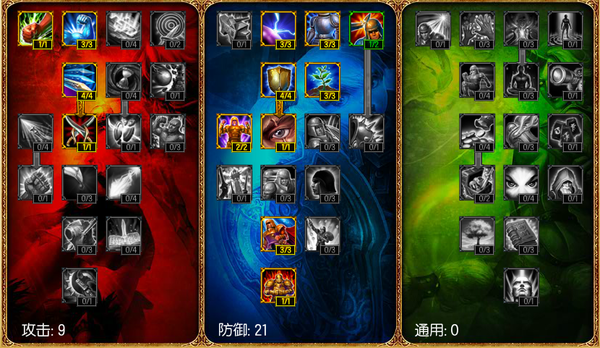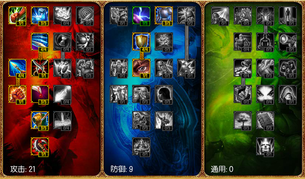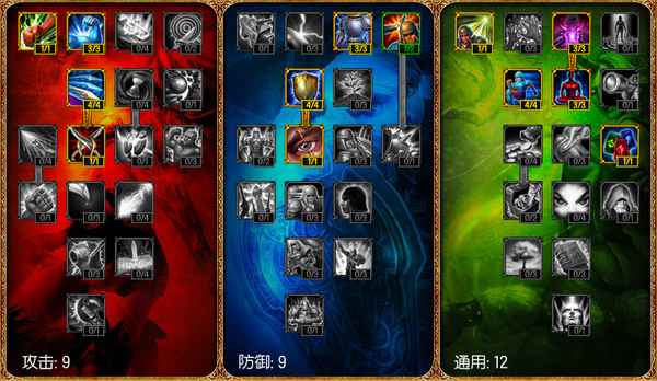 第三套则是我个人比较爱用的,我的想法就是主打前期,9攻击让前期很有侵略性;而9点防御不用多说,不过我在对抗AD上单的时候习惯把第一行的最后一点点到小兵伤害,因为有时候要经常抗兵线控线或者越兵线杀人;最后12点通用则是对抗一些消耗能力很强的比如掘墓豹女我则会吧最后三点点出回蓝,否则就会点到防御里面,而移速的作用就不多说了,能让小虫子多Q几次~~~