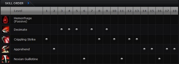五杀神技,超高的爆发,一般的消耗。这个大招是最强的雪球技能之一,因为如果你在对线的时候用这个技能杀死对手的话,就会刷新技能CD。如果你遇到一个高机动的对手又不想他逃走的话,对他使用叠满5层流血的斩杀也行。利用流血和引燃能很轻易地带走他们。