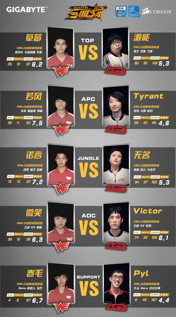 WE.GIGABYTE:成立于2011年4月的WE.GIGABYTE英雄联盟分队在经历了2012年的一系列人事变更以及团队磨合之后,目前正以一套稳定的阵容不断向着职业生涯最高峰努力攀登。作为中国最顶尖的LOL职业战队,他们在国际赛场上也有着不俗的表现,不断为中国战队赢得尊敬并改写着中国队伍在国际大赛上的历史最佳成绩,为英雄联盟项目的欧美、韩国、中国三足鼎立奠定了基础。