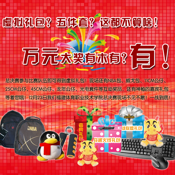 比赛奖项:万元大奖等你来拿!豪华茶叶礼盒,威戈、NBA电脑包,威斯堡运动器材,QQ公仔......众多奖品等着你!