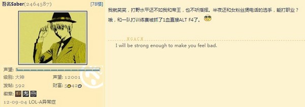 我被你形容成那样一个人让你觉得很开心?我离队2个月以来 有对别人说过一个你们的不字?可倒好,今天让我看到20天前你黑我的回复,我知道你只有17岁,这也是我离队的原因,我没有时间陪你浪费,我把你当个大人看,如果你敢面对你说过的话 发过的帖子 回复过的字字句句,你给我在这说个明白,我是什么原因离队的?是因为真实原因让你蒙羞?
