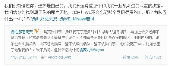 前些日子IF发了一条微博,写了一些道歉和自我反省的话,并@队长若风,导致大家猜测可能是当时因为与队友有些争执,引发了一些误会导致退队。而若风也对IF的这番道歉很有风度的表示“我们没有怪过你”,并给予的美好的祝福。(>>>点击查看事件回顾)