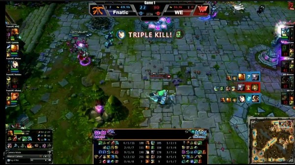 本场比赛Fnatic的上单盲僧各种及时的支援,各种亮眼的极限操作,完全可以说是本场Fnatic的MVP,惹得WE甚至不惜出动4人将其抓死。