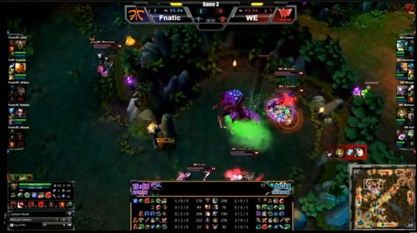 与Fnatic的战斗就一直是场面主动权的争夺,WE主动侵入野区,Fnatic也反过来支援,双方有来有回,互交人头,但WE总体有小赚。