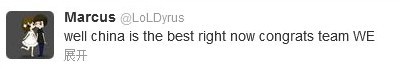赛后,外媒毫不吝啬地赞扬了WE。比赛一结束,著名上单选手“吃货”Dyrus就发来了贺电,称:“中国是最棒的,恭喜WE。”拳头公司游戏分析师 Jatt在推特发言:“WE打得太聪明了,他们不但有实力,而且情商非常高,他们顶住了压力,最终夺冠。”美女电竞记者Rachel说:“干得好,WE,这是一场精彩的比赛!”