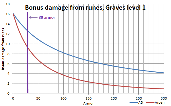 在2赛季的时候,在某个护甲区间里(30-60的护甲),甲穿要比攻击不到75前来的更有威力。在新的护甲穿透系统里,我们还没有证据显示甲穿要比攻击在前期更有优势,实际上,改动并不会让你拥有一套特别的符文时在面对别的ADC有优势。如果出门护甲有30点。(1级的时候远程英雄大概20点,半肉大概35点),一个类似于男枪的英雄会在搭配甲穿的时候比使用固定攻击的符文每击少打3点。或是说固定攻击提高了5%的输出,下面的图标会让你看的更直观些。