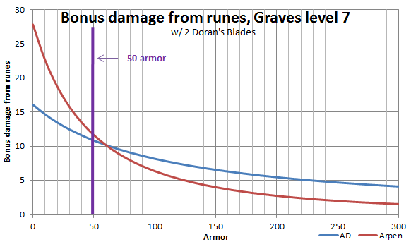但愿这图不会很难懂,红线对应的是护甲穿透的伤害,而蓝线对应的是固定攻击的,而紫线是在这个级别时的平均护甲水平。