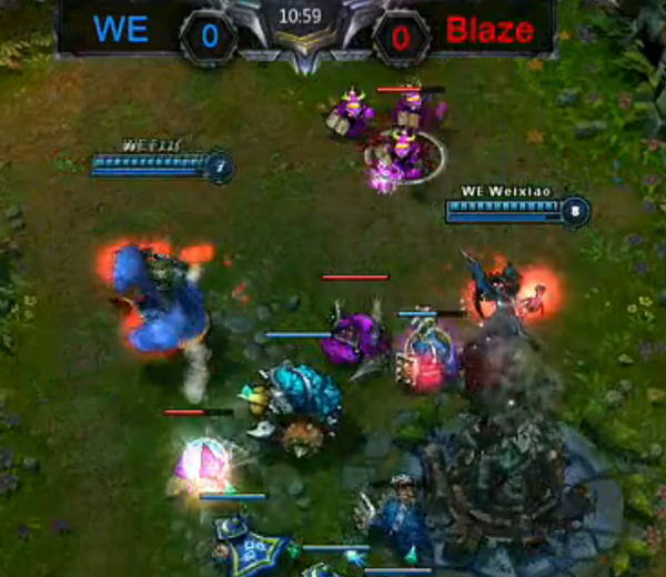 WE却同样迅速换路继续强压!这时得到喘息的盲僧发育反将1血劣势追回,gank上路大嘴成功让AZB扳回补刀几近无望!