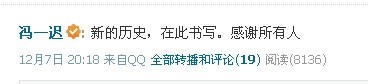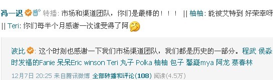 活动开启前夕,冯一迟自称如等待公布成绩时的考生,既“期待新历史的诞生”,又“总有一种心神不宁的感觉”。活动开启约一小时后,冯一迟发文称,“新的历史,在此书写”,并盛赞市场和渠道团队。微博显示,冯一迟的兴奋劲儿一直持续到昨晚,他表示带领团队完成了他自己以及诸神都不相信的事情。