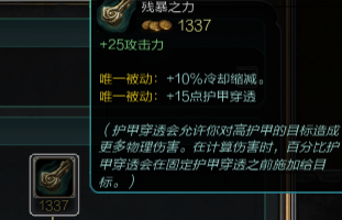 坚固装甲:来自爆击的伤害降低10%。我还能说什么吗。这年头有ad不出黑切的吗。