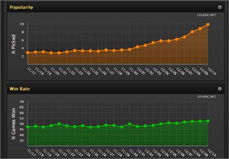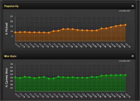 从图的上半部分看,瑞雯的出场率在S3里是有不小的提升的(10%到15%)。而胜率也是慢慢地从50%提升到了接近55%的水准,可以说,S3里物理系上单都过的相当的滋润。