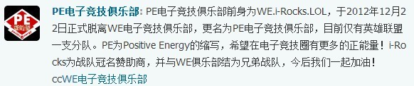 PE电子竞技俱乐部前身为WE.i-Rocks.LOL,于2012年12月22日正式脱离WE电子竞技俱乐部,更名为PE电子竞技俱乐部,目前仅有英雄联盟一支分队。PE为Positive Energy的缩写,希望在电子竞技圈有更多的正能量!i-Rocks为战队冠名赞助商,并与WE俱乐部结为兄弟战队,今后我们一起加油!