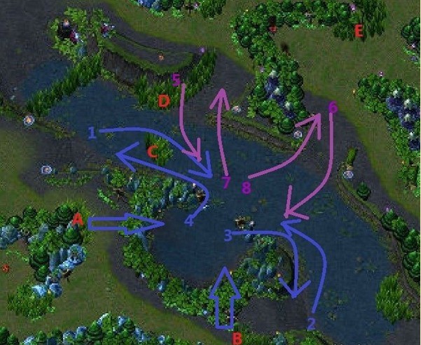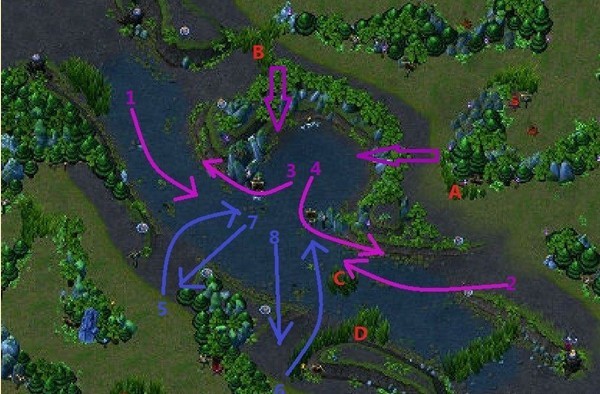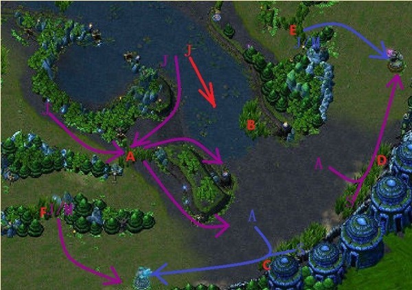 蓝色方:① 由于三角草丛A的位置在紫色方,蓝方的J对Gank的路线就有多种选择了。这就是为什么F4的视野非常重要,因为这不单可以保护自己的野区,同时也可以防止对方的J绕进己方的野区躲过河道视野进行gank。