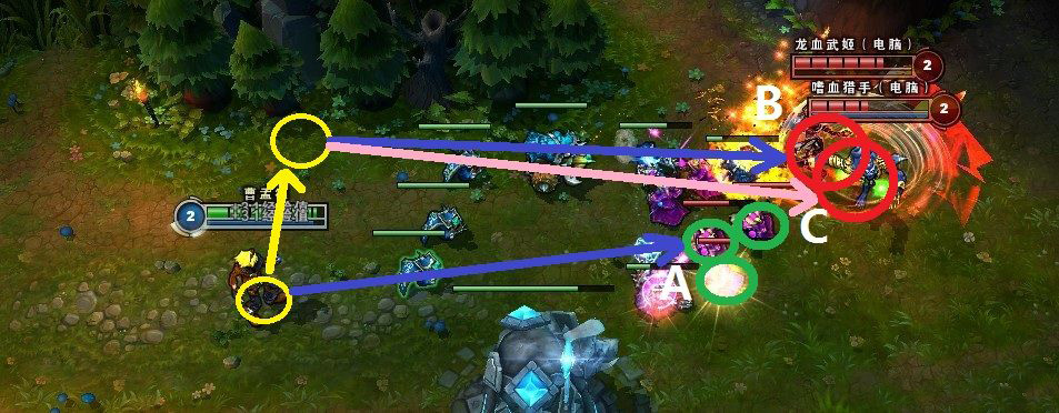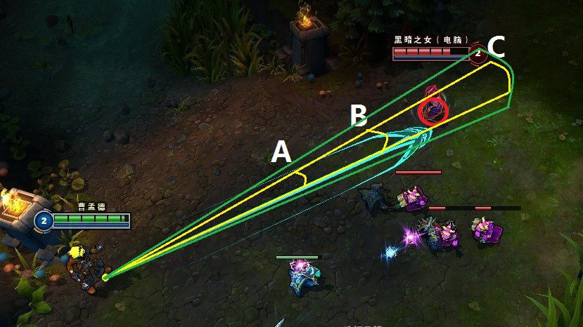 为了提高命中率,正确的释放地点是英雄身后的一段距离,即图中的C点。不用非常仔细的瞄准,回旋的余地较大,技能仍然会命中目标,对比A点,C点施法命中区域大概多了A点一倍不止。