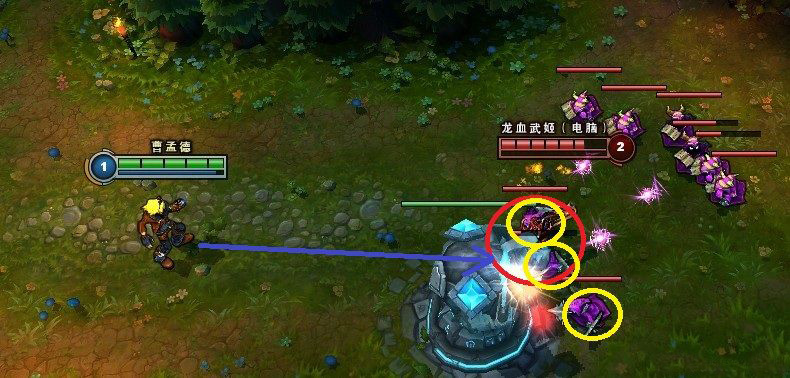 由于龙女的模型要稍微大过小兵一点点的,所以如果遇到类似于图中的场景,可以向稍微下一点的地方释放技能,这样仍然会命中龙女。