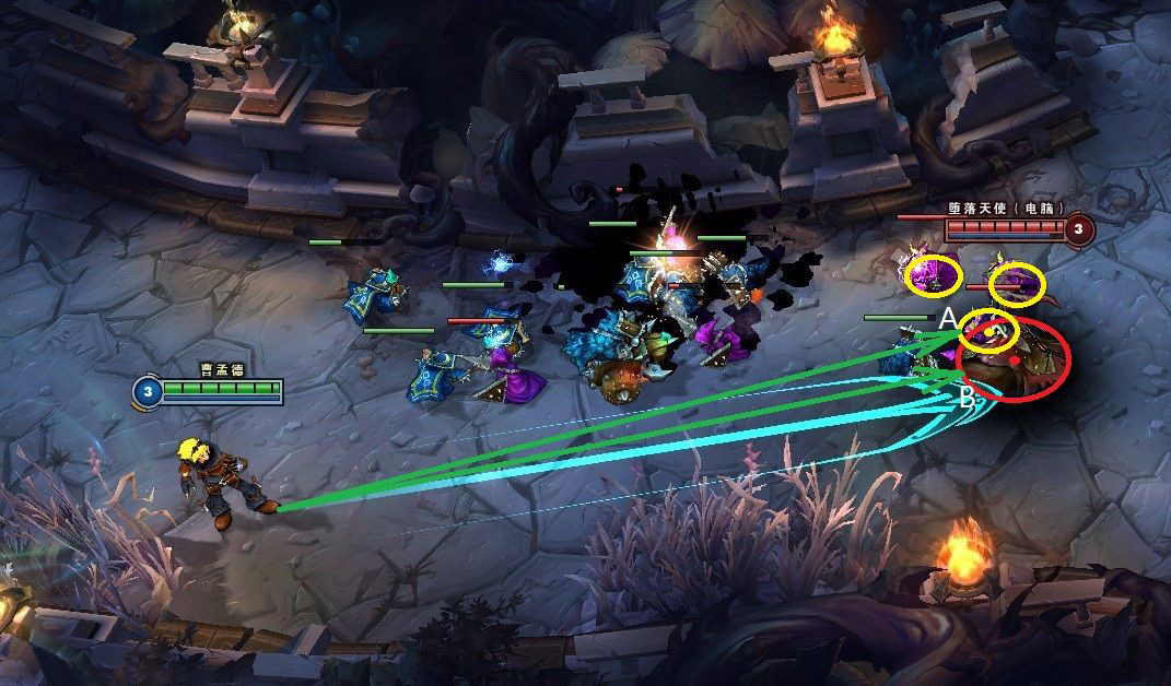 类似于图中的场景,EZ所在的位置有3个小兵阻挡,若想打到狼人身上,按A点释放技能会命中小兵;