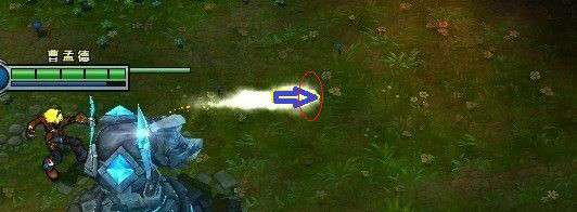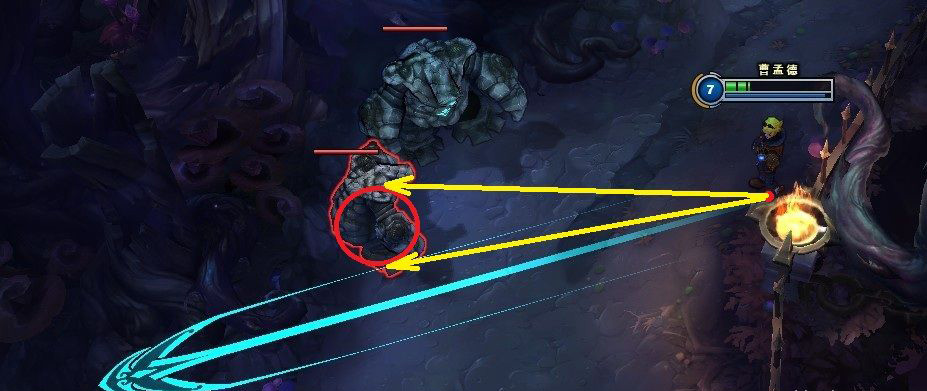 EZ的Q的技能宽度如游戏标示的宽度一样,当技能碰到目标石头人的模型体积后,才会命中此石头人,如图中的方向,看似技能会命中石头人,但是由于这个单位的实际模型体积并没有我们看到的那么大,这个技能按蓝色方向射出便会射空。想要命中目标,只能在黄线以内的地方释放技能。