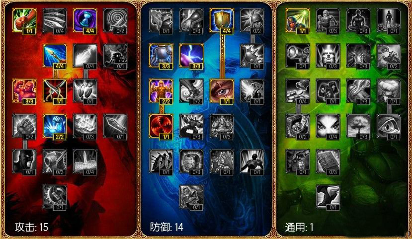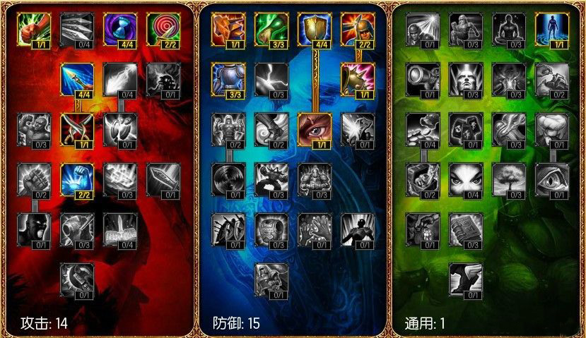 通常情况下建议采用15 / 14 / 1这样的半肉半输出天赋,在对付瑞文,斯巴达这样的英雄的时候甚至可以用 9 / 21/0的防御系天赋。攻击里面的攻速不如冷却时间发挥的效果好,所以放弃点出冷却时间。防御系格挡5点伤害配以多兰盾可以格挡掉敌法英雄11点的普攻伤害,十分适合锤石这样的英雄。