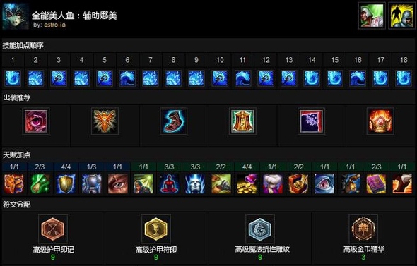 但她也是一个相对脆弱的存在,足够的防御很必要,我推荐使用0 9 21的天赋并佩戴红色护甲印记最大化她在下路的生存能力。如果你感觉很缺蓝红色也可以用回蓝印记。对抗琴女、婕拉和日女这种进攻性强的辅助时,魔抗印记也值得推荐。