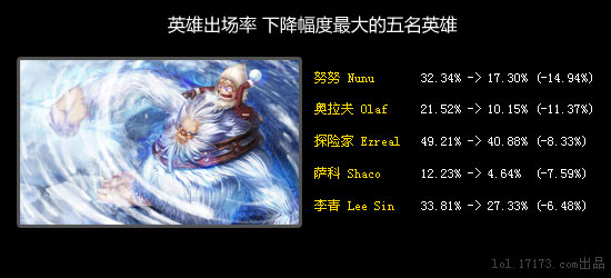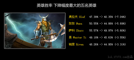 感谢Voyboy用上单奥拉夫在比赛里大杀四方,Riot觉得奥拉夫必须被削弱。这次削弱明显是针对高端局的,奥拉夫在单人排位的胜率从来没超过50%,现在已经在40%左右浮动了。