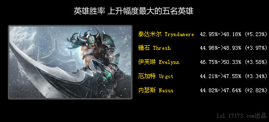 貌似单排玩家终于知道如何更好的使用锤石了,当然和宝石骑士相比,他需要更多的技巧,所以胜率低于宝石骑士也是情有可原。如果锤石能在英雄联盟联赛(LCS)中出现,也许他的出场率会有较大的变化,让我们拭目以待。