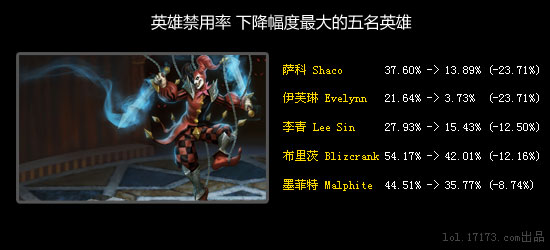 小丑的Q技能范围和E技能减速都受到小幅度削弱,但是这也足以将他的胜率拉到50%以下,出场率直降2/3,现在已经到20%左右了。近期出现一些反弹也是合理的,但是最近的一次改动对他的影响太大了。