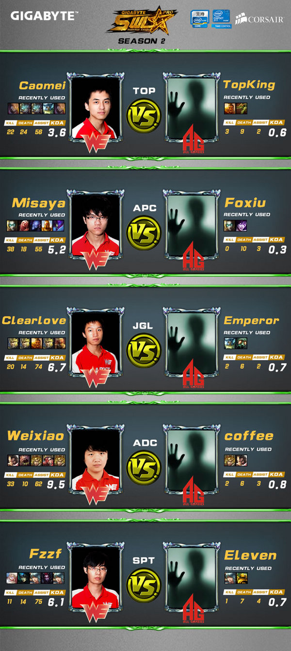 基本已经锁定一个小组出线名额的WE对抗基本已经出线无望的AG,两队都没有什么成绩上的负担,以轻松的心态的面对,小编比较期待双方会不会拿出什么有趣的英雄组合,不过整体实力占据绝对优势的WE应该能以2:0顺利拿下这场比赛吧。