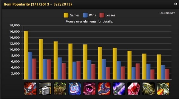 以突飞猛进的速度在美服数据资料上显示从未上过热门物品使用率榜单的它在一天内急升至第七名,同时也成为了美服AD类英雄人手一把的必须品,玩家称他们为“破败联盟”。