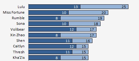 在整个IEM7的比赛中,辅助英雄璐璐的被选率是最高的,她被选择了25次并赢得了其中的13场比赛;而她的好搭档好运姐则排名第二。璐璐和好运姐是在本次比赛中经常出现的组合,喜欢下路的玩家不妨和自己的好基友练习一下这个组合。在榜中,排名3至10位的英雄分别是:兰博、琴女、狗熊、赵信、慎、女警、锤石、卡兹克。
