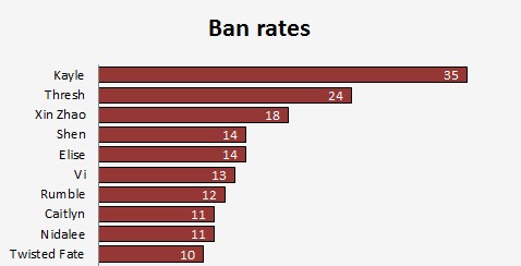 这项统计是基于那些被选过五次以上的英雄的,他们的胜率排名依次为:劫、女警、大嘴、炼金、EZ、锤石、狗熊、慎、拉克丝、蜘蛛。