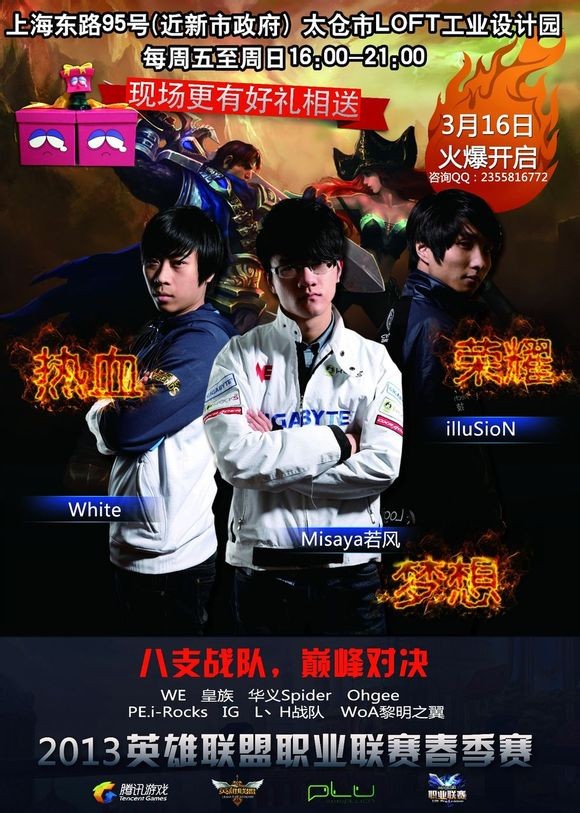 春季赛从3月16日打响,至6月1日结束,为期三个月。八支战队每周的星期五、六、日三天都会以线下赛的形式进行巅峰对决,每天都会进行五场比赛,一周共十五场精彩较量!绝对能够让每一位英雄联盟的粉丝过足精彩比赛之瘾,所以如果你有时间有兴趣有能力的话,一定不能错过这么精彩的线下比赛,与喜欢的偶像零距离,这可是所有英雄联盟玩家最大的愿望!