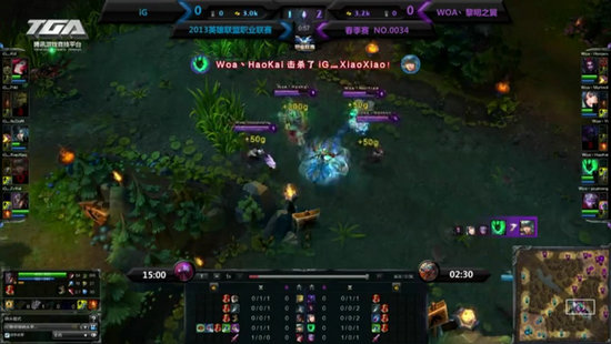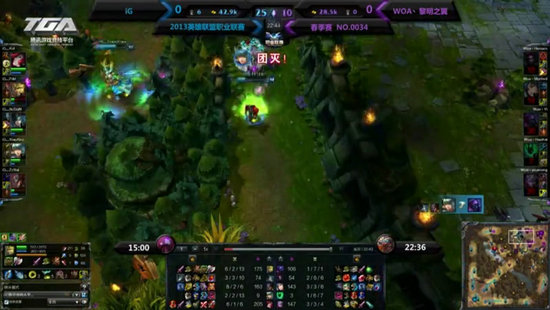 WOA选择与iG正面一级团,前期WOA拿到了3:1的开局。但是iG选择换路之后依靠线上的功力渐渐的扳回了局面。之后iG的团战不断的扩大优势,甚至双方展开了一场长达6分钟的团战。PDD成为全场的焦点,精妙的伤害计算,良好的走位。让PDD多次赢得欢呼。最后iG拿下了这场比赛。