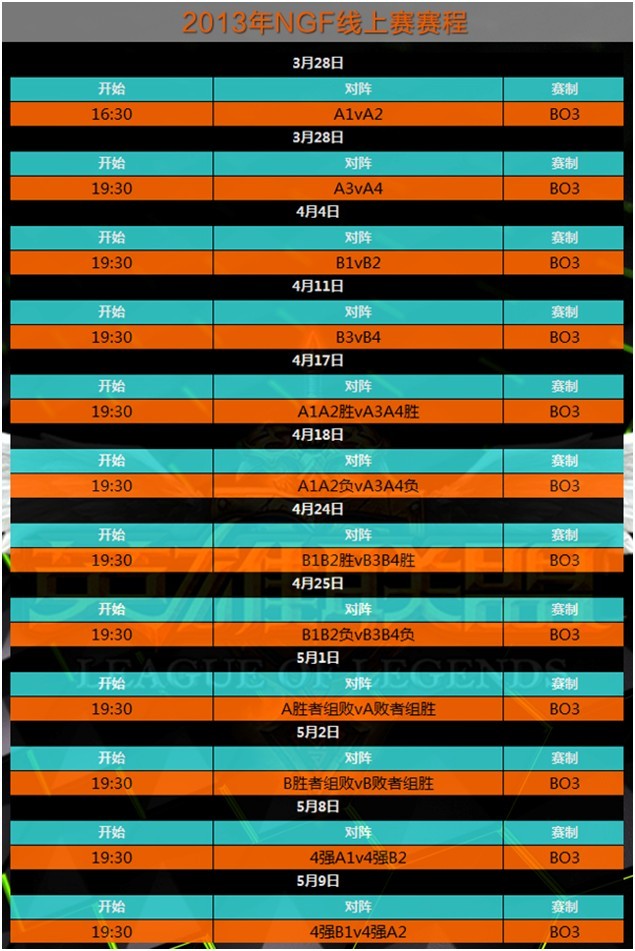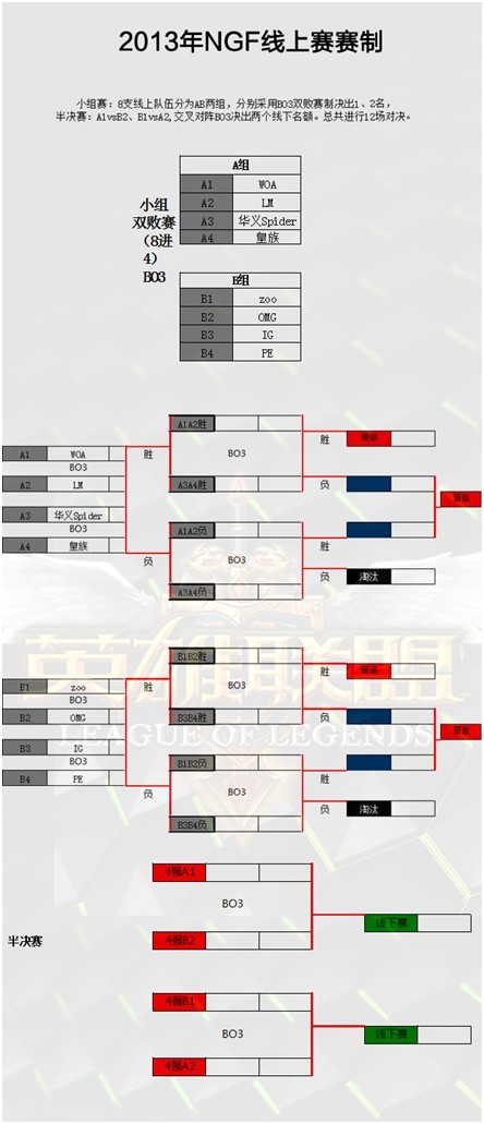 沿袭前两年的传统,在2013年的春季,我们将再次为大家带来NGF2013的消息。从3月28号开始,我们将为所有玩家全程带来NGF2013英雄联盟项目的线上预算赛直播及赛事报道。获得线上预选赛第一名的队伍,将晋级到今年的线下总决赛!