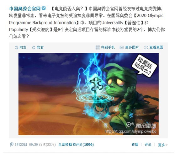 近日,中国奥委会也发微博称,《英雄联盟》或将加入2016年里约奥运会成为正式的体育比赛项目,这使得《英雄联盟》在这场争论中再次受到了大众的广泛关注。作为决定奥运项目存留的两个重要标准,普遍性和受欢迎度已是电子竞技现阶段具备的优势条件。