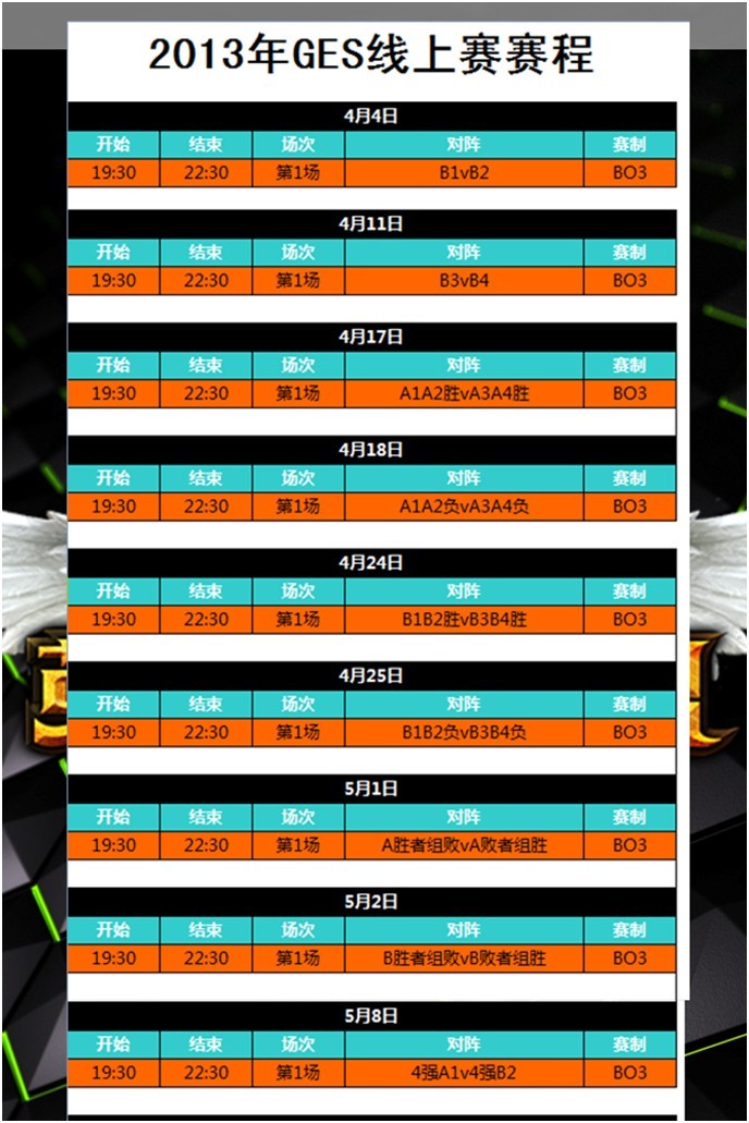 沿袭前两年的传统,在2013年的春季,我们将再次为大家带来GES2013的消息。从3月28号开始,我们将为所有玩家全程带来GES2013英雄联盟项目的线上预算赛直播及赛事报道。获得线上预选赛第一名以及第二名的队伍,将晋级到今年的线下总决赛!