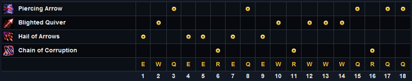 这个技能才是韦鲁斯在对线期的最强技能,这是一个范围很远的范围减速和伤害技能,同时还附加降低治疗效果,可以成为很强的限制走位技能,因为你可以在一个区域创建持续的减速效果,在打龙和男爵的时候也很有用。它可以用来阻止gank,或者配合gank,配合队友先手。这是在对线阶段很强的骚扰手段,搭配