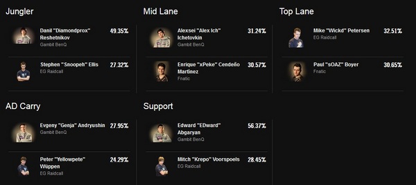 Voyboy、Dyrus的票数非常接近,这与目前网络票选的情况相似。就像Edward,HotshotGG是唯一没有将ADC票投给队友Doublelift的选手。
